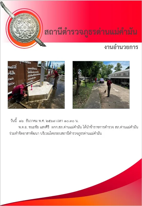 ผลการดำเนินงาน ด้านอำนวยการและบริการทั่วไป/ด้านบริหารงานและพัฒนาบุคลากร ประจำเดือน ธันวาคม 2567 16 ธันวาคม 2567 โดย admin / ผลการดำเนินงานของสภ.ด่านแม่คำมัน,(งานอำนวยการ) วันนี้ 16 ธันวาคม พ.ศ. 2567 เวลา 10.30 น. พ.ต.อ. ชนะชัย แสงศิริ ผกก.สภ.ด่านแม่คำมัน ได้นำข้าราชการตำรวจ สภ.ด่านแม่คำมัน ร่วมทำจิตอาสาพัฒนา บริเวณโดยรอบสถานีตำรวจภูธรด่านแม่คำมัน Post Views: 16 Facebook iconFacebookTwitter iconTwitterLINE iconLine