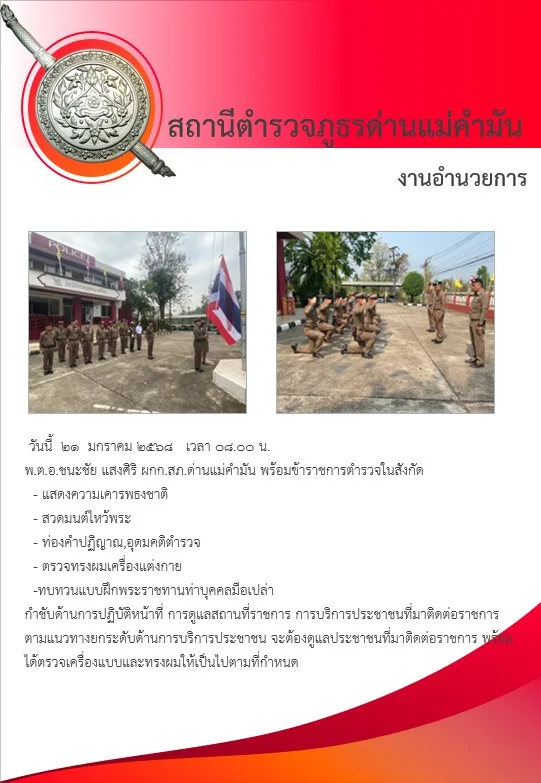 กำชับด้านการปฏิบัติหน้าที่ การดูแลสถานที่ราชการ การบริการประชาชนที่มาติดต่อราชการตามแนวทางยกระดับด้านการบริการประชาชน จะต้องดูแลประชาชนที่มาติดต่อราชการ พร้อมได้ตรวจเครื่องแบบและทรงผมให้เป็นไปตามที่กำหนด