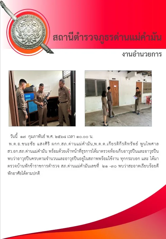 ผลการดำเนินงาน ด้านอำนวยการและบริการทั่วไป/ด้านบริหารงานและพัฒนาบุคลากร ประจำเดือน กุมภาพันธ์ 2568 17 กุมภาพันธ์ 2568 โดย admin / ผลการดำเนินงานของสภ.ด่านแม่คำมัน,(งานอำนวยการ) วันนี้ 17 กุมภาพันธ์ พ.ศ. 2568 เวลา 10.00 น.พ.ต.อ.ชนะชัย แสงศิริ ผกก.สภ.ด่านแม่คำมัน,พ.ต.ต.เกียรติกีรติทรัพย์ พูนไพศาล สว.อก.สภ.ด่านแม่คำมัน พร้อมด้วยเจ้าหน้าที่ธุรการได้มาตรวจห้องเก็บอาวุธปืนและอาวุธปืน พบว่าอาวุธปืนครบตามจำนวนและอาวุธปืนอยู่ในสภาพพร้อมใช้งาน ทุกกระบอก และ ได้มาตรวจบ้านพักข้าราชการตำรวจ สภ.ด่านแม่คำมันเลขที่ 21 -30 พบว่าสะอาดเรียบร้อยดี พักอาศัยได้ตามปกติ Post Views: 23 Facebook iconFacebookTwitter iconTwitterLINE iconLine