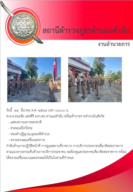 วันนี้ 14 มีนาคม พ.ศ. 2568 เวลา 08.00 น. พ.ต.อ.ชนะชัย แสงศิริ ผกก.สภ.ด่านแม่คำมัน พร้อมข้าราชการตำรวจในสังกัด