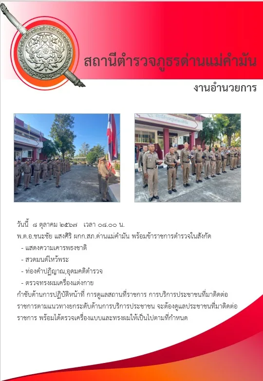 – ตรวจทรงผมเครื่องแต่งกาย กำชับด้านการปฏิบัติหน้าที่ การดูแลสถานที่ราชการ การบริการประชาชนที่มาติดต่อราชการตามแนวทางยกระดับด้านการบริการประชาชน จะต้องดูแลประชาชนที่มาติดต่อราชการ พร้อมได้ตรวจเครื่องแบบและทรงผมให้เป็นไปตามที่กำหนด