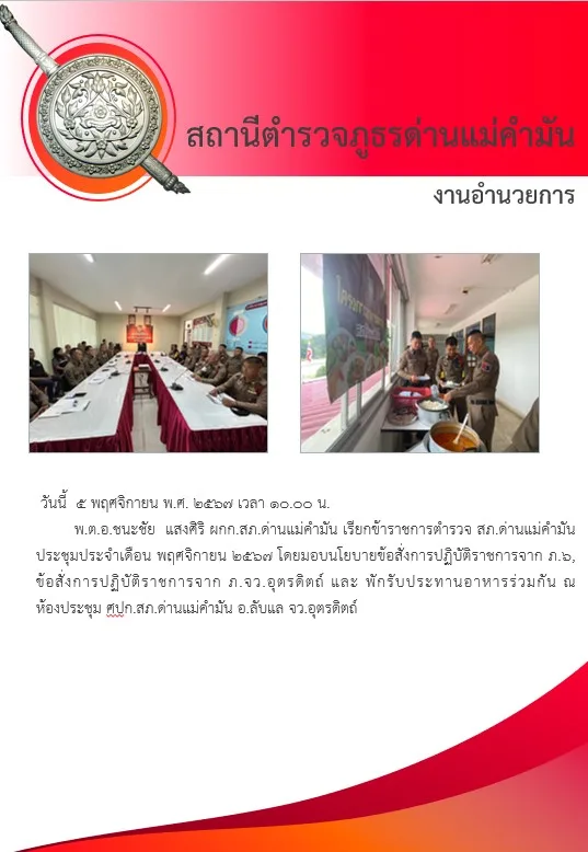 ผลการดำเนินงาน ด้านอำนวยการและบริการทั่วไป/ด้านบริหารงานและพัฒนาบุคลากร ประจำเดือน พฤศจิกายน 2567 5 พฤศจิกายน 2567 โดย admin / ผลการดำเนินงานของสภ.ด่านแม่คำมัน,(งานอำนวยการ) วันนี้ 5 พฤศจิกายน พ.ศ. 2567 เวลา 10.00 น. พ.ต.อ.ชนะชัย แสงศิริ ผกก.สภ.ด่านแม่คำมัน เรียกข้าราชการตำรวจ สภ.ด่านแม่คำมันประชุมประจำเดือน พฤศจิกายน 2567 โดยมอบนโยบายข้อสั่งการปฏิบัติราชการจาก ภ.6, ข้อสั่งการปฏิบัติราชการจาก ภ.จว.อุตรดิตถ์ และ พักรับประทานอาหารร่วมกัน ณ ห้องประชุม ศปก.สภ.ด่านแม่คำมัน อ.ลับแล จว.อุตรดิตถ์ Post Views: 14 Facebook iconFacebookTwitter iconTwitterLINE iconLine