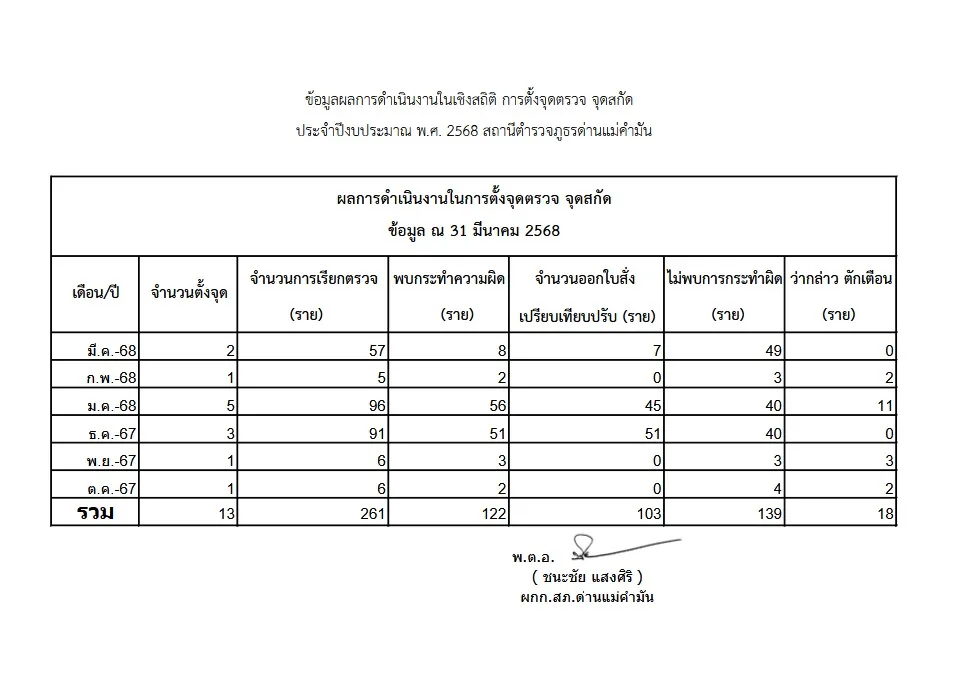 ผลการดำเนินงานในการตั้งจุดตรวจ จุดสกัด ข้อมูลประจำเดือน มีนาคม 2568